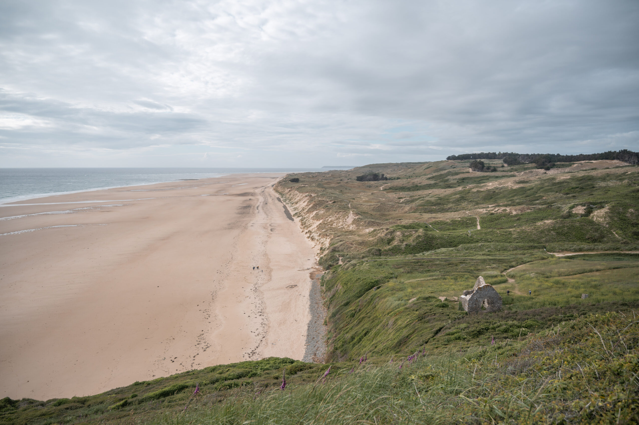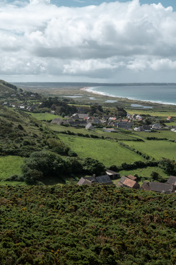 Nous commençons ce troisième jour par un arrêt au prieuré de Saint-Hermel, un lieu hors des sentiers battus offrant une vue à 180° sur l’anse de Vauville. Au loin, on aperçoit même les dunes de Biville, notre prochaine étape dans ce road trip.