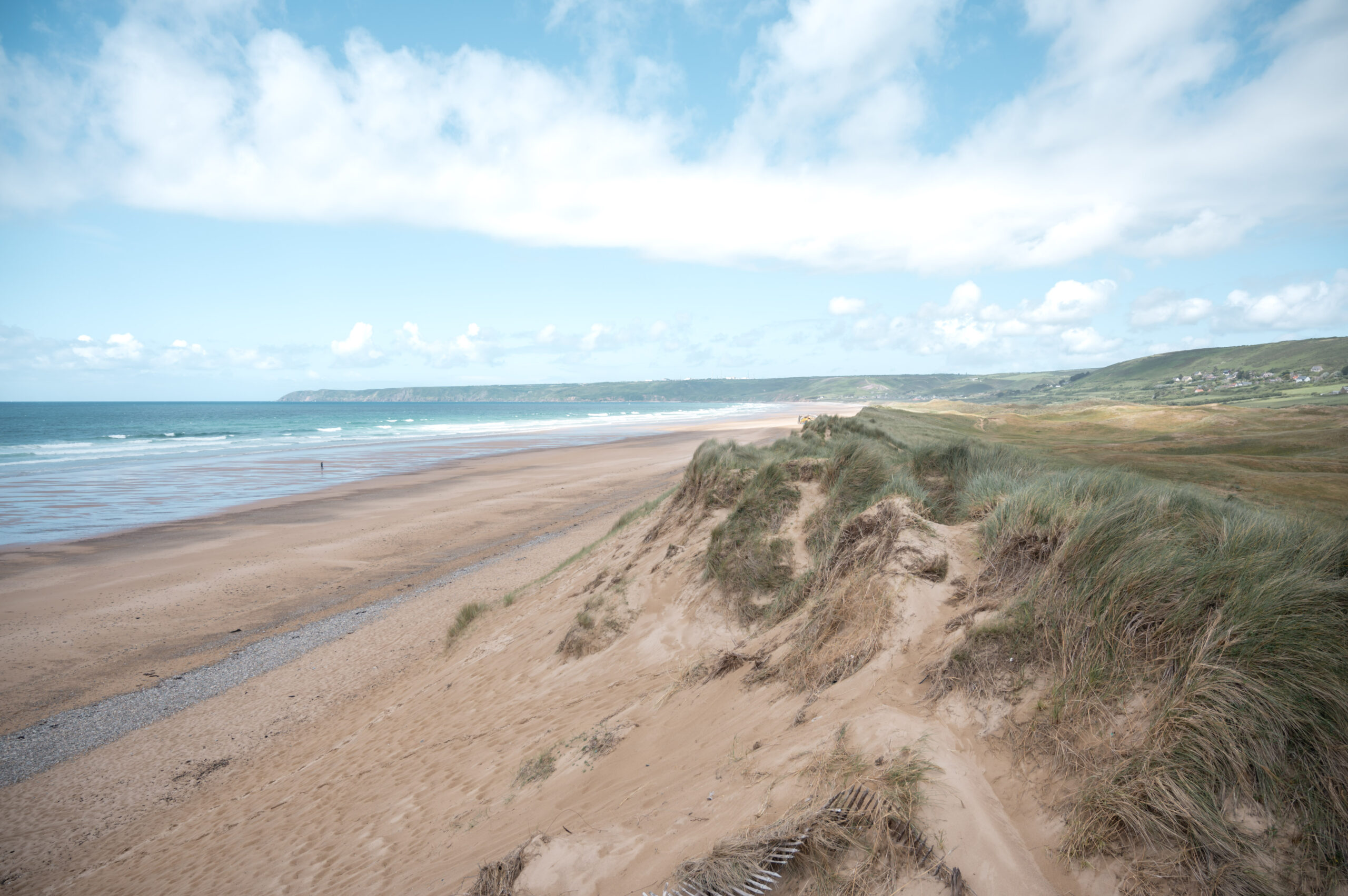 Direction la Plage de Biville, un véritable joyau naturel niché dans l’Anse de Vauville, entre le Nez de Jobourg et le Cap de Flamanville. Ce site, renommé pour ses vastes dunes de sable qui s’étendent sur des kilomètres, forme un paysage presque lunaire.